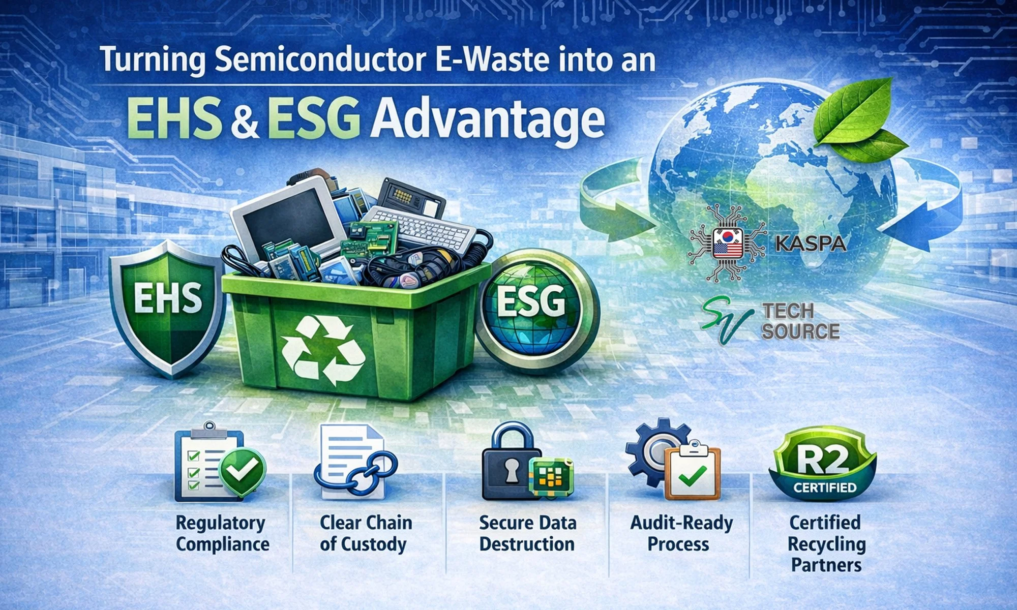 KASPA and SV Tech Source are making semiconductor recycling simple, safe, and compliant. Our program helps EHS and facilities teams manage e-waste, surplus IT, and recyclables with a structured, audit-ready approach aligned with semiconductor operating requirements,.Email koamspa@gmail.com to learn more about a small no-obligation pilot program.